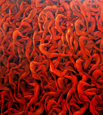 In urban design or medical advisory, clustering may not be recommended for healthy habitation of people. But Okpu takes another look at the word and adapts it for visual expression to support his argument about the importance of people bonding, always. For examples, in visual expressiveness, his works such as Rhythm In Red, Blue Hues and Rhythm in Blue are aesthetically inviting with their sea of figures overlapping each other.